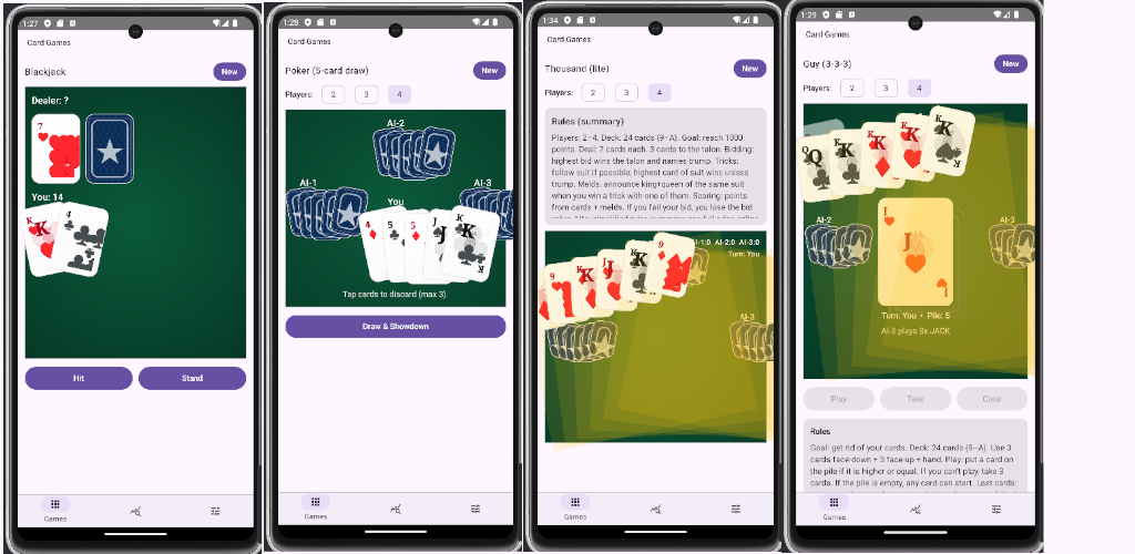 A pack of classic offline card games with AI opponents: Blackjack, 5-card draw Poker, Makao, Thousand (lite), Guy (3-3-3) and Solitaire (lite). Quick and simple.